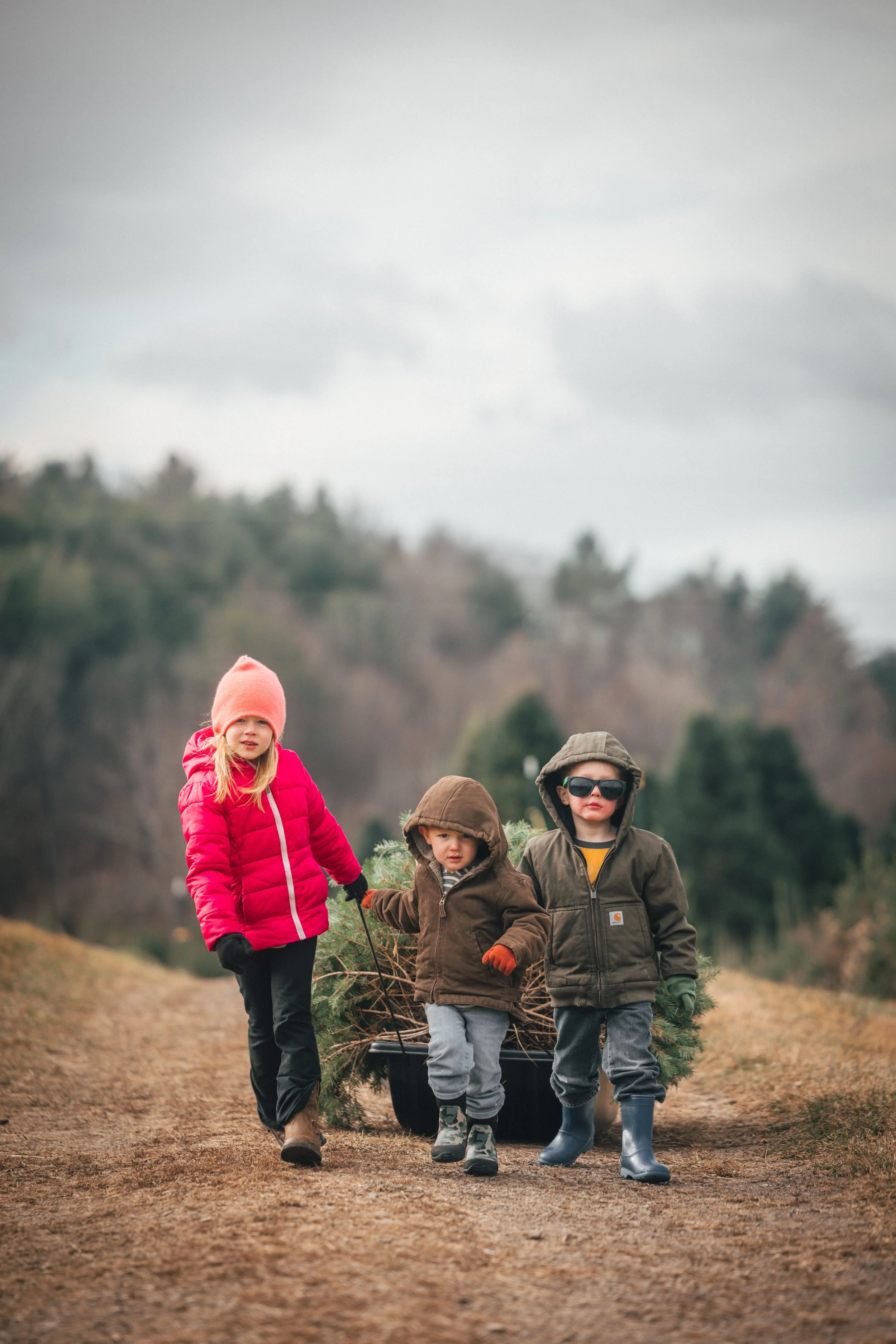 family pulling choose and cut Christmas tree at tree farm near Altoona PA